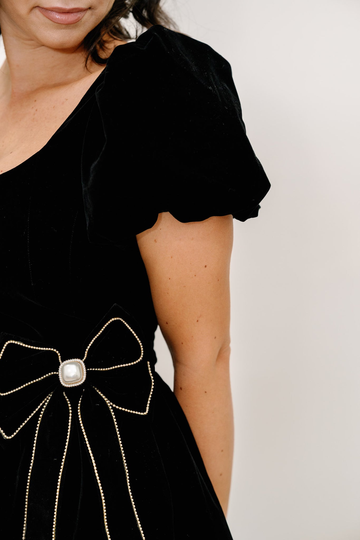 This sophisticated mini dress features a flattering scoop neckline and voluminous short puff sleeves that add contemporary flair. The back showcases delicate smocking details with a concealed zipper for seamless styling. Cut in a graceful A-line silhouette, it's the perfect choice for holiday celebrations and evening events where refined elegance matters.