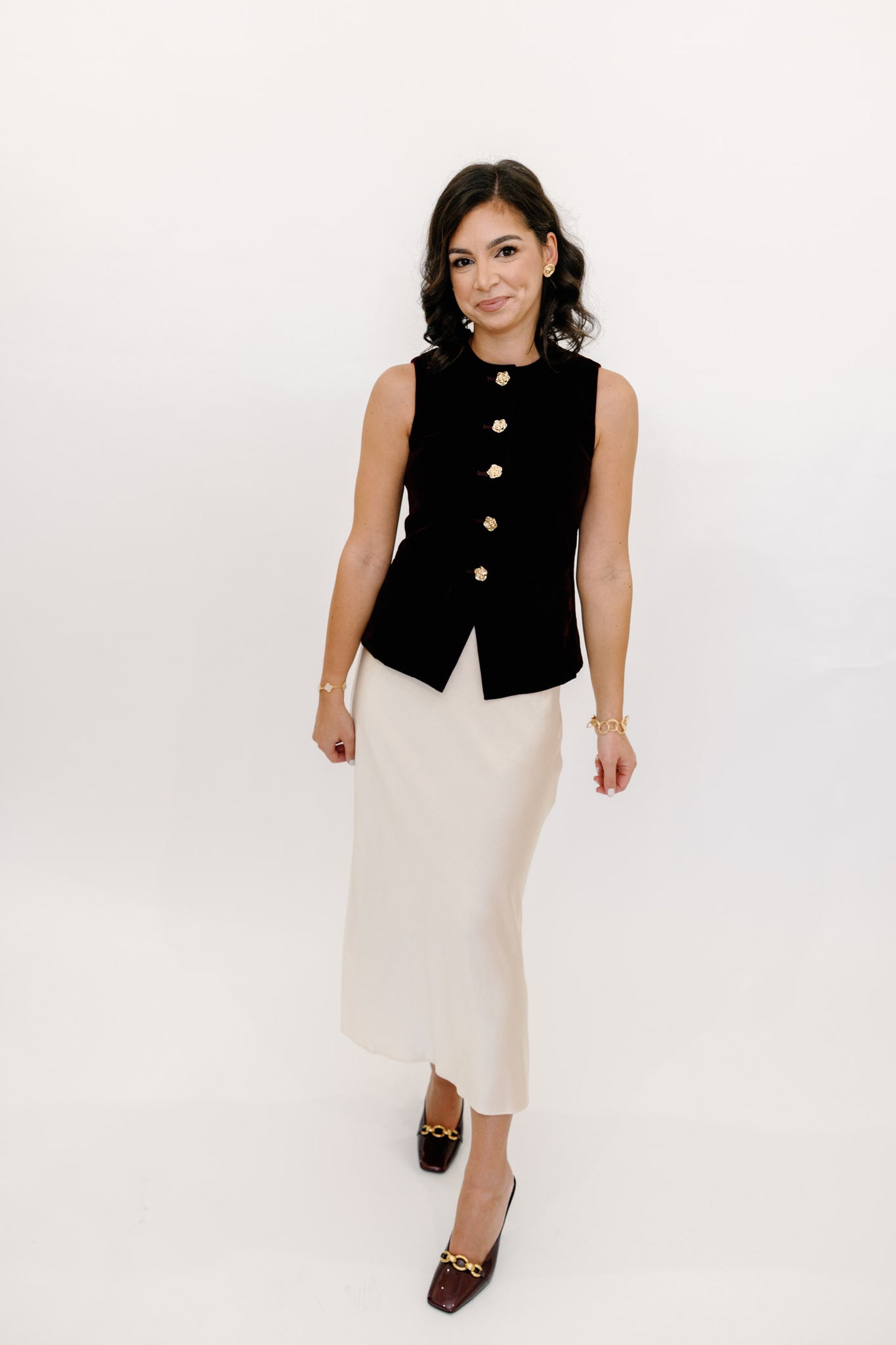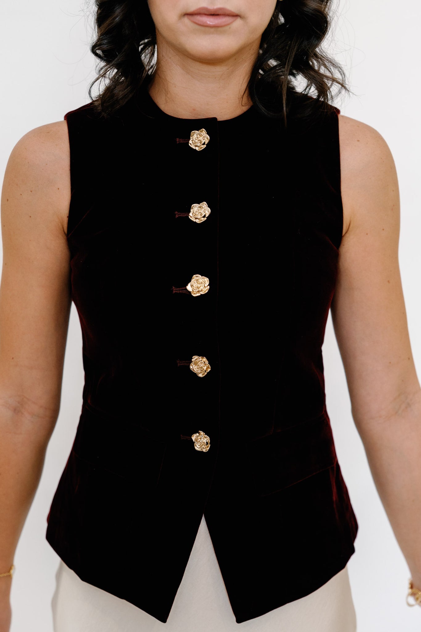 This sophisticated sleeveless vest top features a refined round neckline and elegant gold button hardware that elevates any ensemble. The button-down front and split hem design create a modern silhouette perfect for holiday gatherings and special occasions. Fully lined for comfort and structure, this plum velvet piece seamlessly transitions from festive celebrations to elevated everyday wear.
