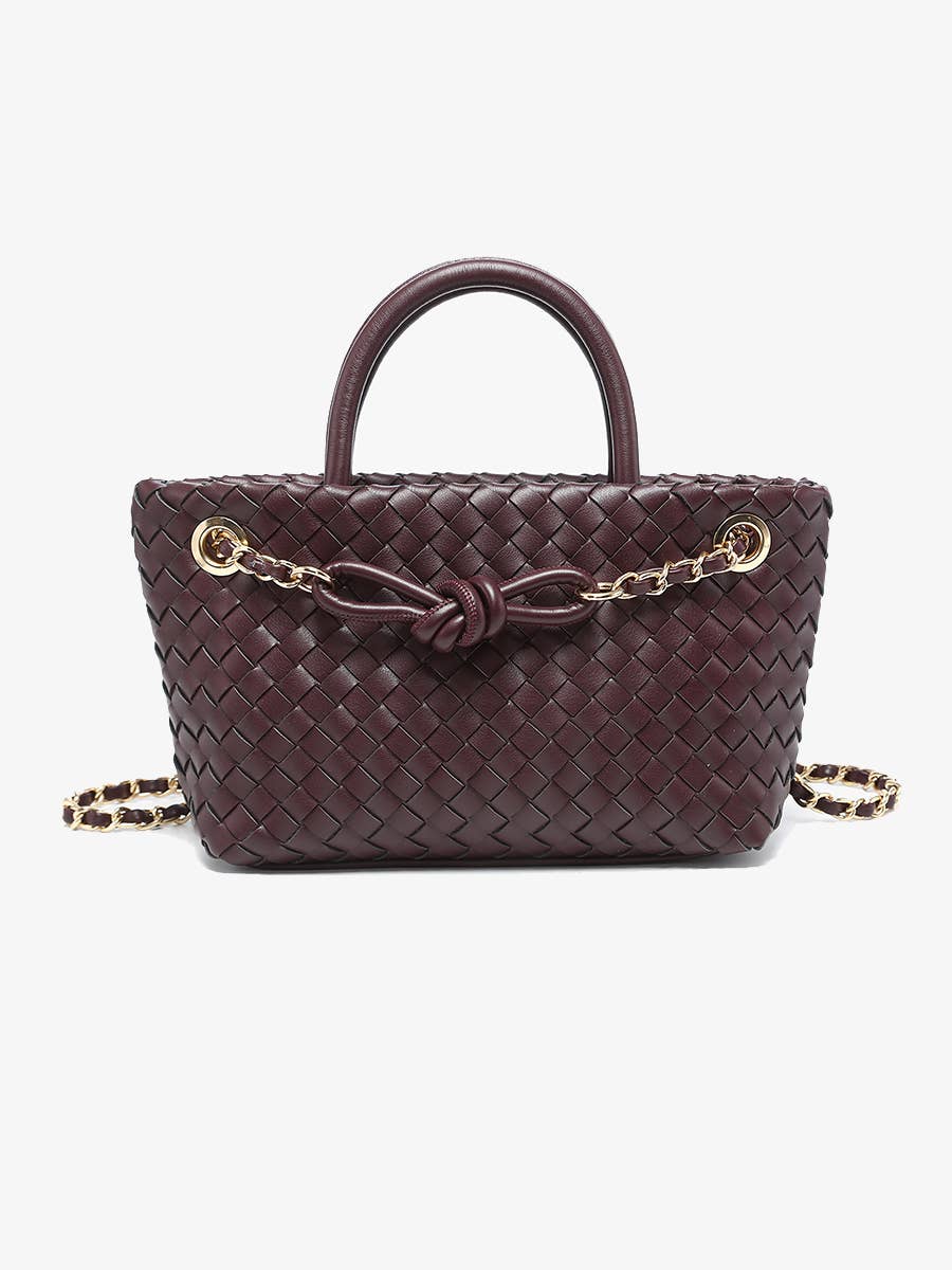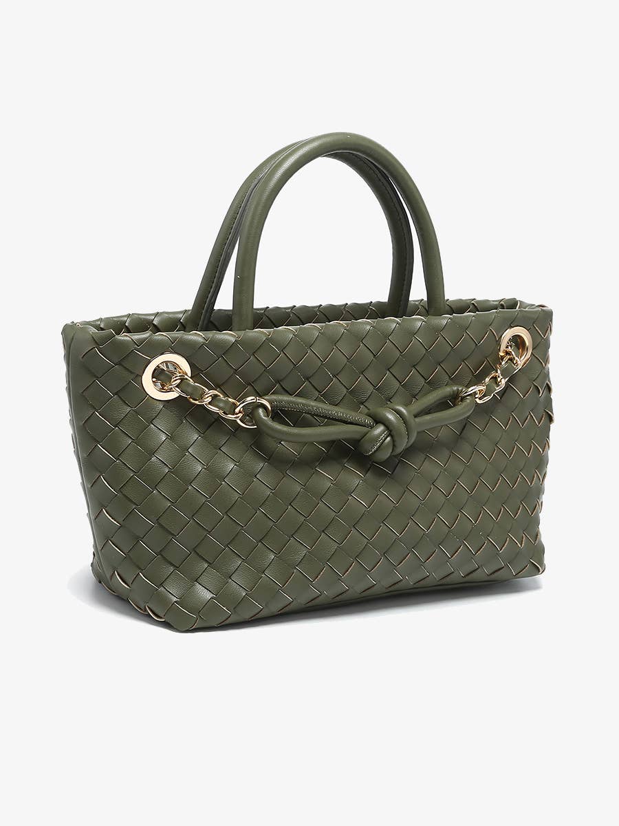 A stylish woven satchel that combines classic texture with modern chain strap versatility.