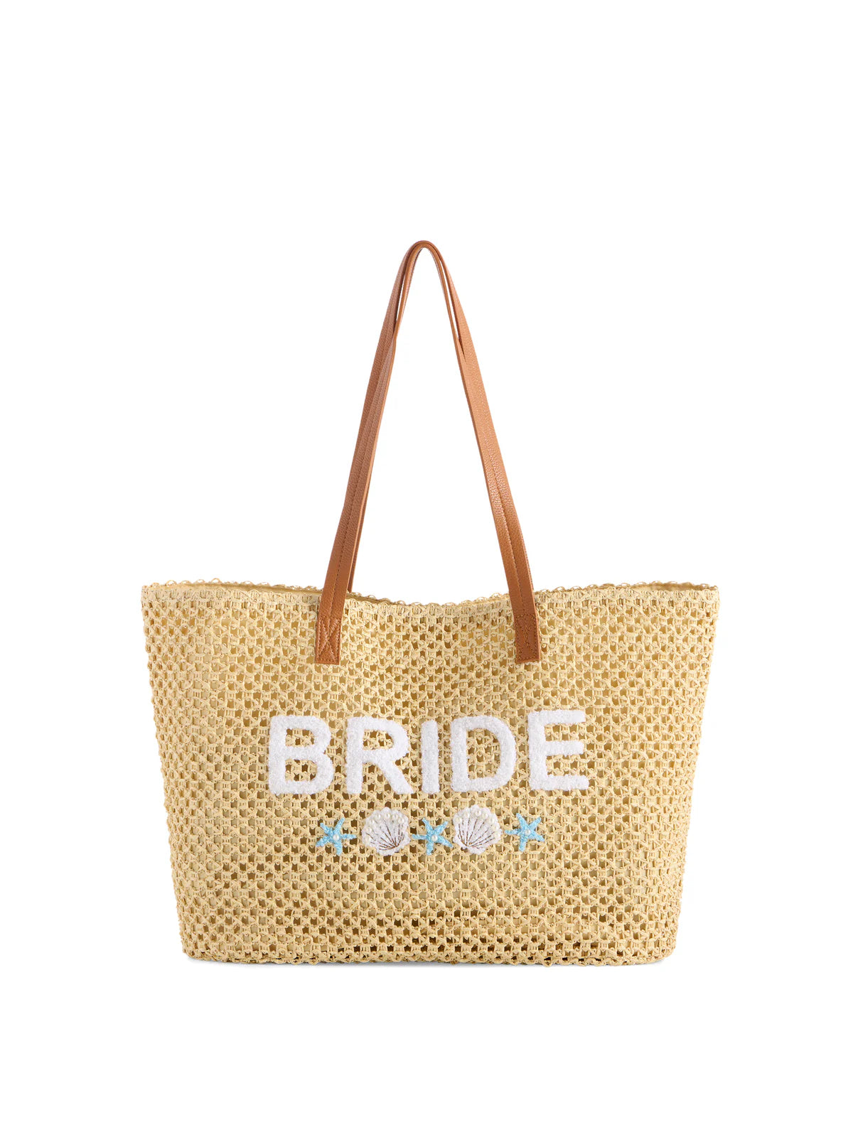 The "Bride" Shell Tote brings beachy bridal energy to your big weekend plans. Designed with an open weave straw texture, shoulder-length handles, and crisp white “Bride” embroidery framed by seashell and starfish motifs, it’s made to turn heads from the welcome party to the pool. A magnetic snap closure keeps everything secure, while the inner slip pocket adds a touch of organization. Pair it with the matching Shell Zip Pouch for the ultimate coordinated moment.