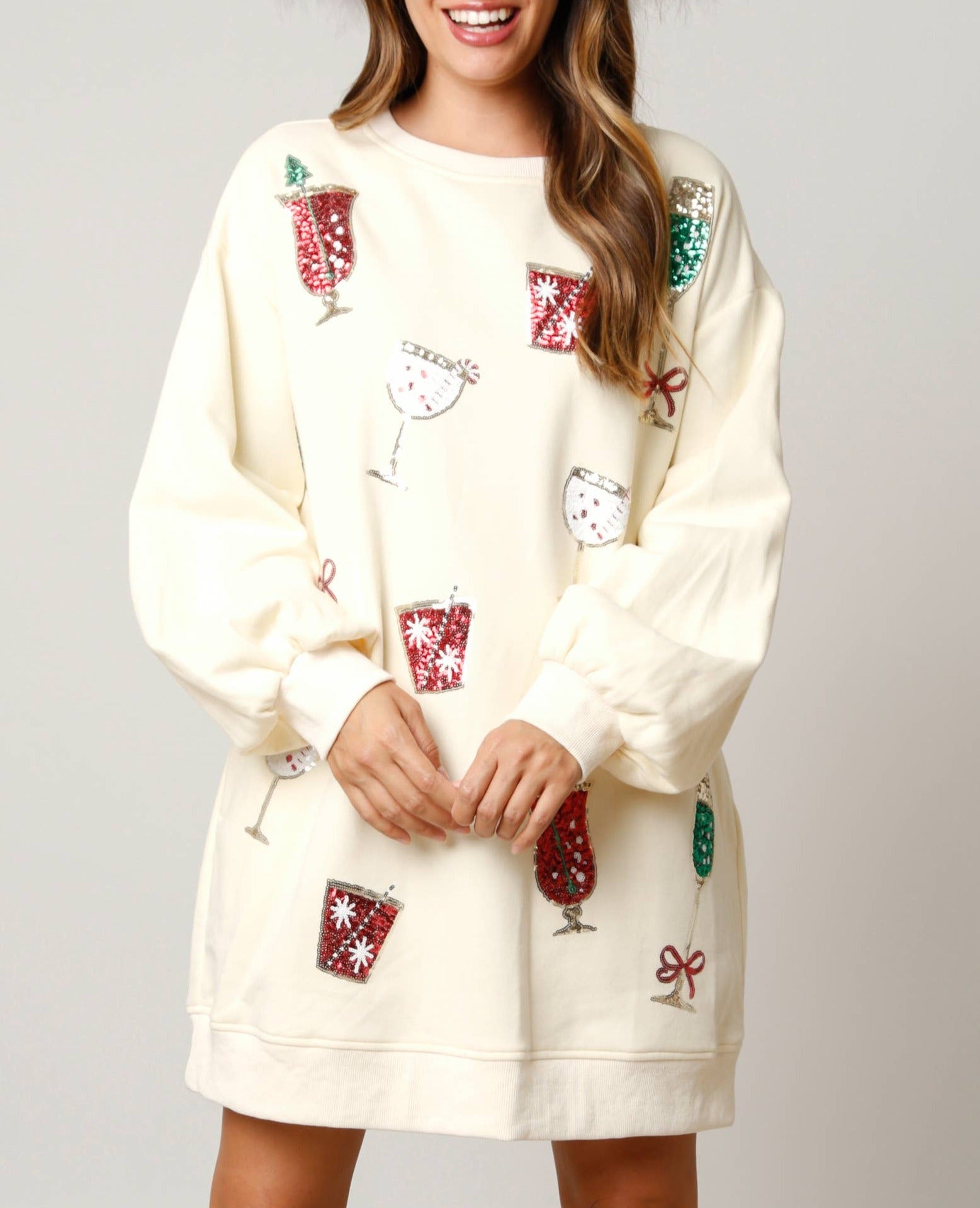 This classic cream sweatshirt dress is adorned with all-over sequin patches of colorful holiday cocktail glasses.